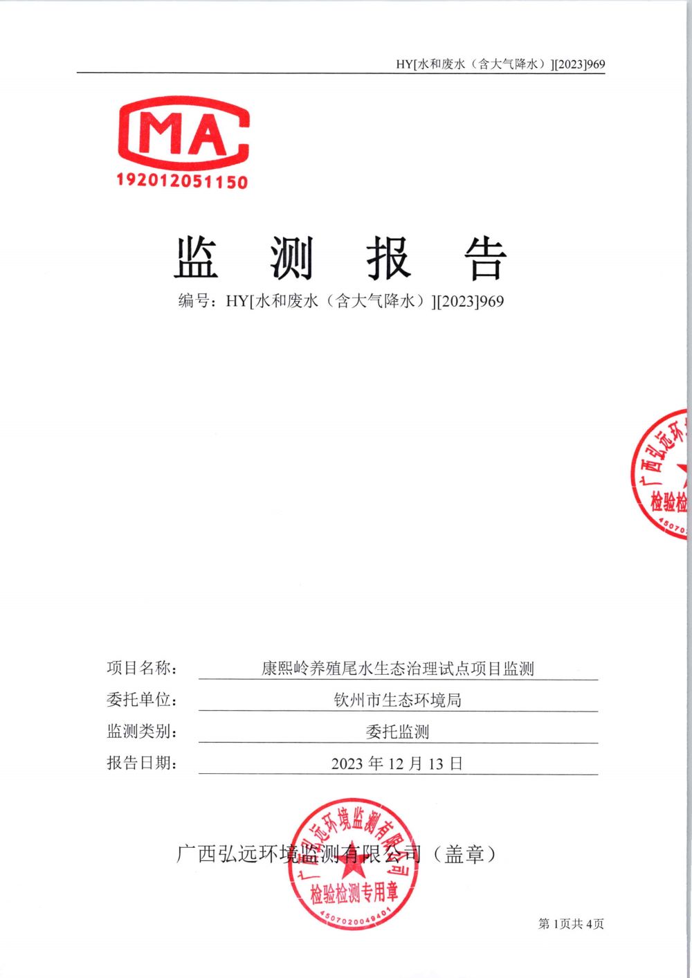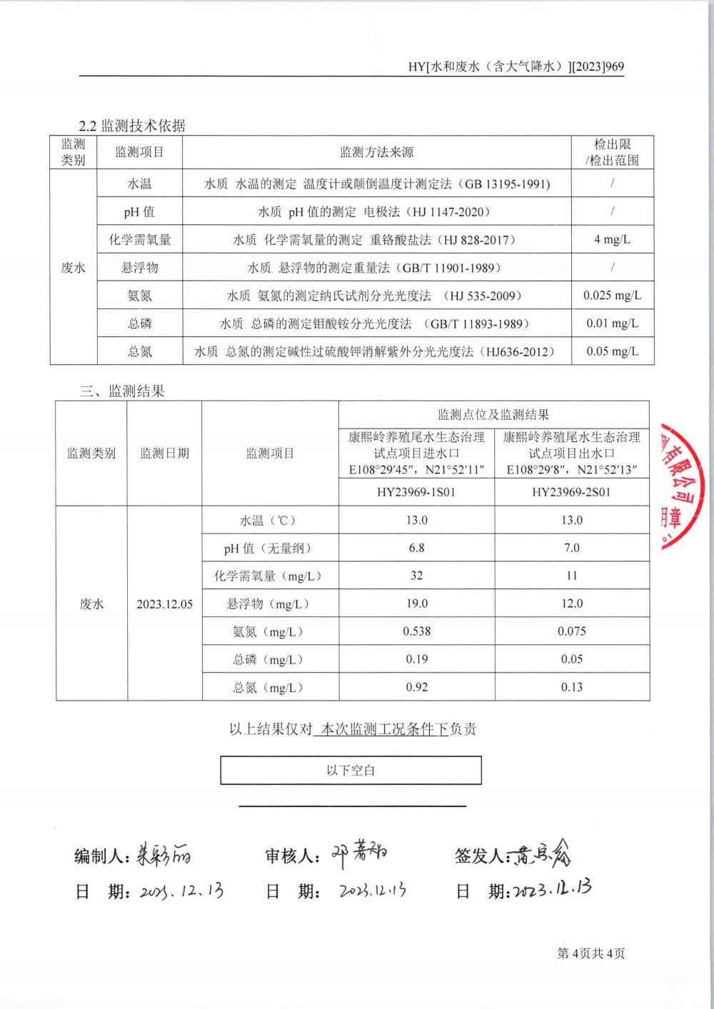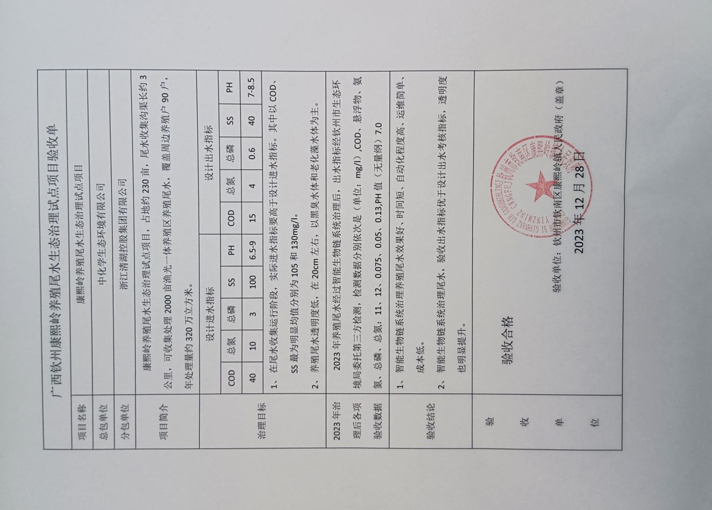 2023 年養殖尾水經過智能生物鏈系統治理后,出水指標經欽州市生態環境局委托第三方檢測,驗收出水指標優于設計出水考核指標,透明度也明顯提升,完成了預期治理目標,成功通過驗收。
