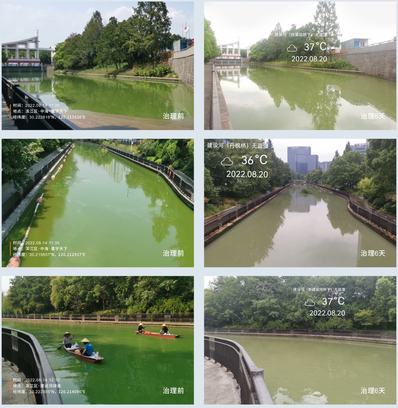 2022年8月3日,浙江清湖控股集團受杭州市濱江區城市河道保護管理中心、杭州市濱江區生態環境局邀請,針對區內建設河和解放河兩條河道爆發藍藻進行實地考察。清湖公司技術團隊對兩條河道進行了現場勘察及水質檢測后,制定了快治理方案,方案通過了相關部門審核并簽約,項目8月14日正式進場治理。